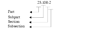 (1) The numbering system permits the discrete identification of every FAR paragraph. The digits to the left of the decimal point represent the part number. The numbers to the right of the decimal point and to the left of the dash represent, in order, the subpart (one or two digits), and the section (two digits). The number to the right of the dash represents the subsection. Subdivisions may be used at the section and subsection level to identify individual paragraphs. The following example illustrates the make-up of a FAR number citation (note that subchapters are not used with citations):